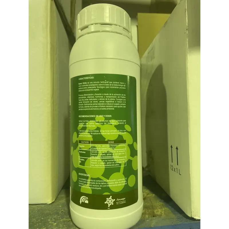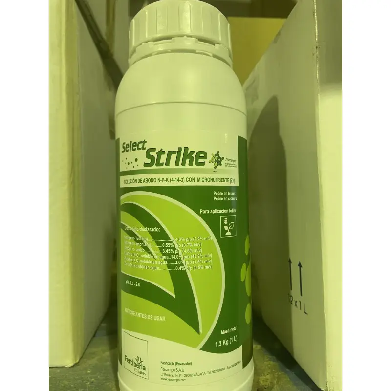 SELECT STRIKE es una solución fertilizante que contienen macro y micro nutrientes complejados con Biotecnología del Carbono BTC®. Activa las rutas metabólicas que favorecen los procesos de hinchado de yemas, floración y cuajado del fruto. Es un potenciador fenológico para incrementar procesos básicos en el desarrollo vegetal, favoreciendo la división celular, el desarrollo de pelos absorbentes y el crecimiento horizontal del cultivo. Propiedades: · Favorecedor de los procesos de enraizamiento de las plantas. · Provoca diferenciación y floración a través de la activación de aminoácidos, vitaminas, hormonas y transporte del fósforo hacia las zonas radiculares y aéreas de la planta. · Consigue una rápida formación de raíces y yemas vegetativas. Es un inductor de la floración. · Incrementa el índice de cuajado y asegura un mayor sostenimiento de frutos. · Aporta a la planta el Fósforo necesario para ayudar a las plantas a superar la dormancia y el estrés ambiental. · Estimula la formación de yemas laterales. Intensifica la asimilación de compuestos inorgánicos por complejación con compuestos orgánicos que reducen la retrogradación, volatilización y lixiviación de nutrientes esenciales para los cultivos. · Promueve el crecimiento de las raíces adventicias/laterales. Ventajas de utilización: · Garantiza un mayor cuajado y homogeneidad de frutos · Brotación de yemas más rápida, uniforme y vigorosa. · Aumento del tamaño de frutos. · Puede ser aplicado de forma foliar, sin problemas de fitotoxicidades ni quemaduras, y aportando una rápida y eficaz asimilación y traslocación de nutrientes. · Totalmente orgánico y sin plazo de seguridad. · Fácil de usar, líquido y con bajos costes de manejo.