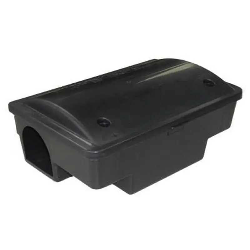 De polipropileno de alto impacto. Evita peligros a niños, animales domésticos y protege el cebo. Cierre con llave. Para cebos sólidos y líquidos.